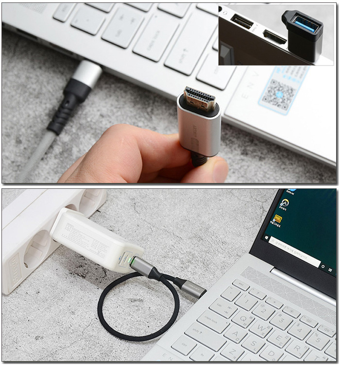 반개마크가 있는 양 측면의 A타입 USB 단자와 썬더볼트 4 단자는 상시전원을 지원해 노트북이 꺼진 상태에서도 스마트폰을 충전할 수 있다. 상단의 사진은 테스트를 진행하고 있는 모습으로 정상적으로 충전되는 것을 확인할 수 있었다.