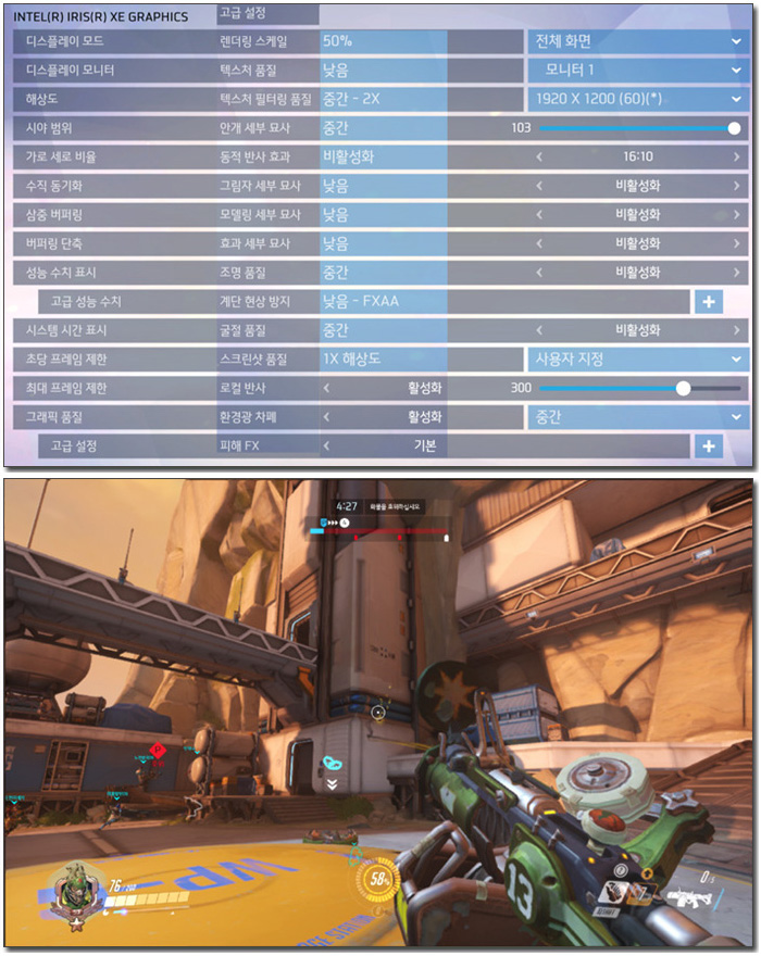오버워치를 구동해 프레임 테스트를 진행하고 있는 모습으로 '중간' 옵션에서 76-113 프레임을 보여주었다. UHD 그래픽을 사용하는 구형 노트북과 분명한 성능 차이를 경험할 수 있을 것이다.