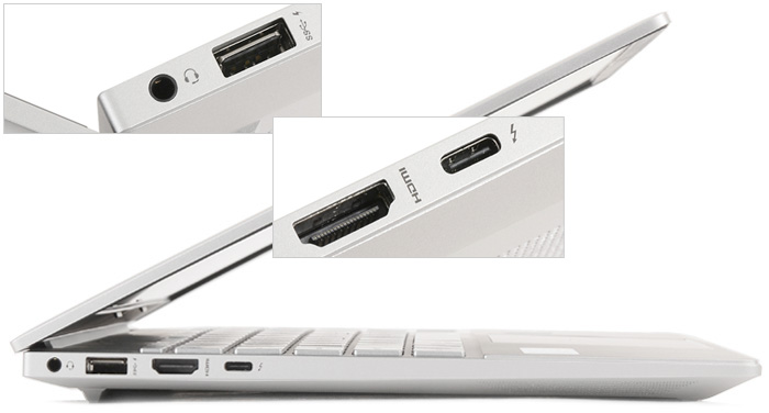 기기 좌측면의 모습으로 헤드셋이나 이어폰 연결을 위한 오디오 (COMBO) 단자와 주변기기 연결을 위한 USB 3.2 Gen1 단자가 설치되어 있고 HDMI 2.0 단자를 제공해 4K 모니터를 연결해 작업용으로 활용할 수 있다. 또한 고급형 노트북 답게 썬더볼트 4 단자를 지원해 사용성을 높였다.