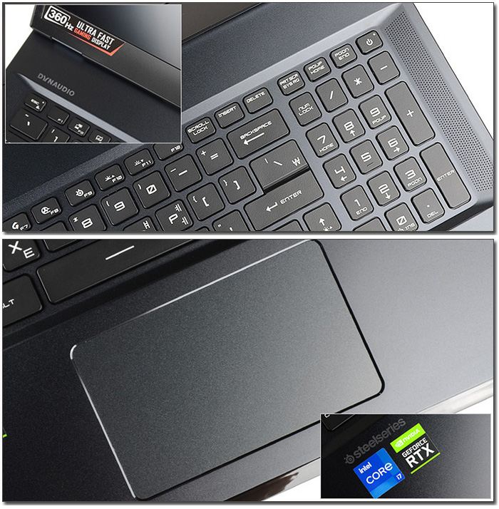 17.3형 대화면을 지원하는 모델답게 텐키가 포함된 풀사이즈 키보드가 장착된 것을 확인할 수 있다. 특히 스틸시리즈의 Per-Key RGB 키보드를 지원해 단색 조명의 일반 노트북과는 확연히 비교되는 조명 효과를 즐길 수 있으며 안티고스팅을 지원해 대부분의 게임에서 동시입력으로 인한 오작동 없이 플레이에 집중할 수 있다.