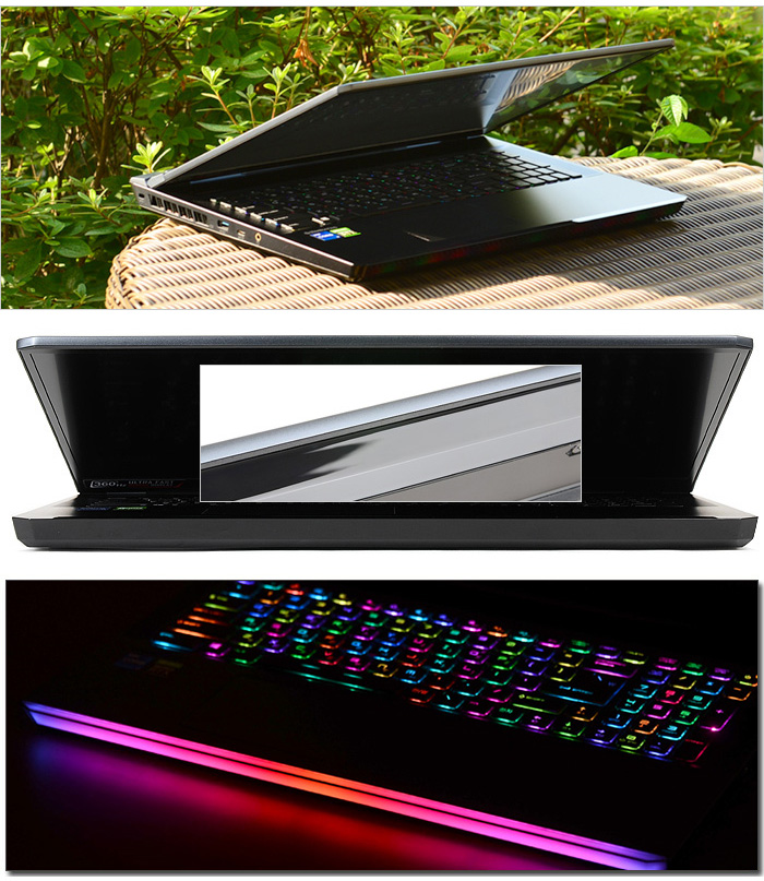 또한 144Hz 주사율을 지원하는 일반 게이밍 노트북과 달리 360Hz 주사율 지원으로 압도적인 부드러움을 경험할 수 있으며 일반 노트북과 달리 전면에 1670만 컬러의 파노라믹 오로라 라이팅이 설치되어 환상적인 조명 효과를 즐길 수 있다. 또한 99.9Whr 용량의 배터리가 장착되어 있으며 다인오디오 듀오 웨이브 우퍼가 장착되어 사실감 넘치는 사운드를 즐길 수 있다.