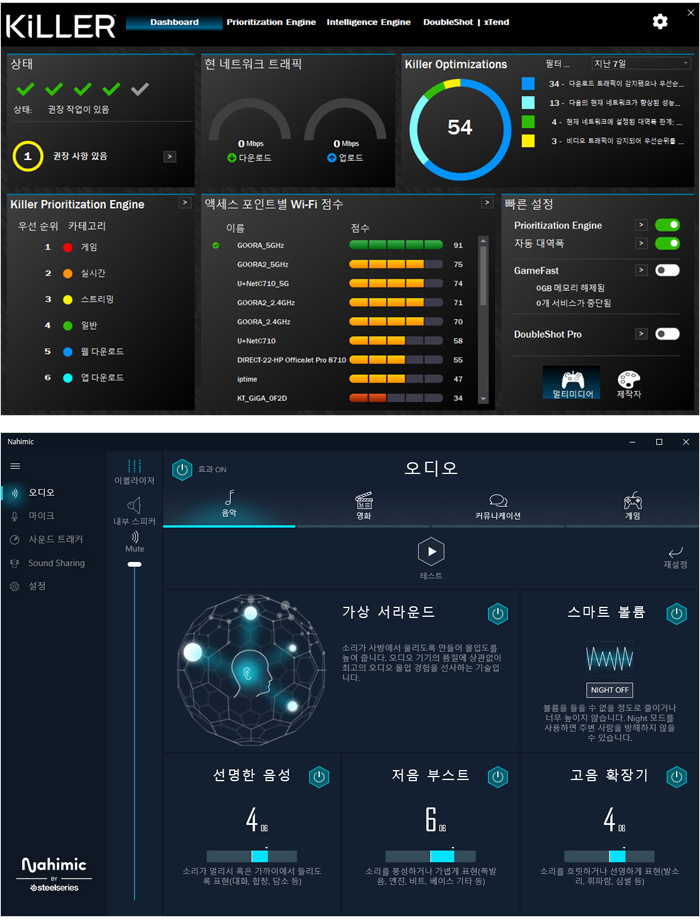 유/무선 킬러랜을 지원해 안정적인 네트워크 환경에서 게임을 즐길 수 있으며 나히믹 3 지원으로 사용자에 맞는 최적의 음색을 설정할 수 있다. (디자인 부분에서 언급했던 사운드 쉐어링도 지원하는 것을 확인할 수 있다.)