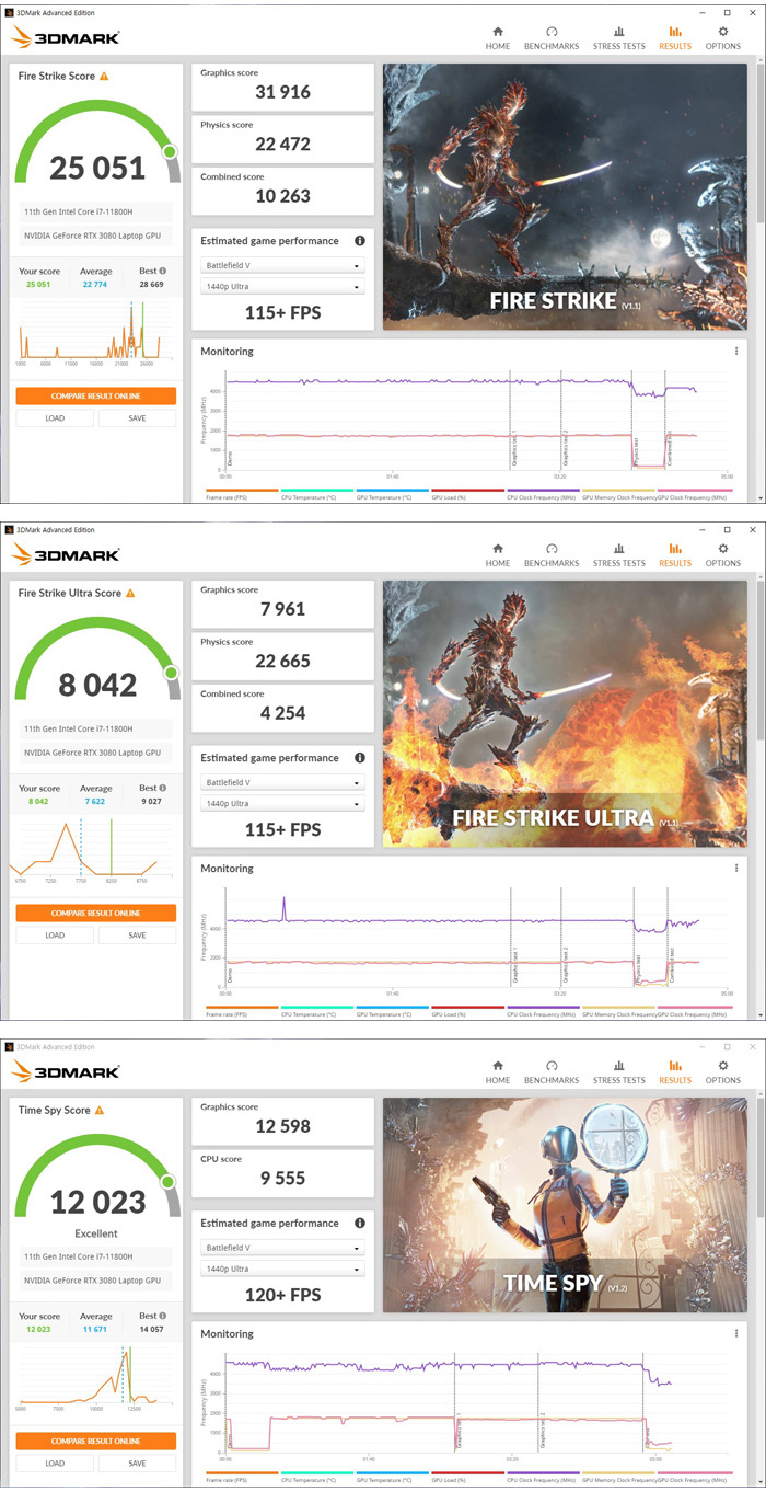 3DMARK를 이용해 3D 성능을 확인하고 있는 모습으로 구형 GPU는 물론 하위 모델인 RTX 3070과도 분명한 스코어 차를 보여주고 있다. 최신 게임을 최상위 옵션에서 플레이 할 수 있을 것이다.