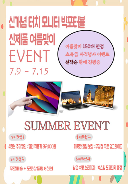 행사는 선착순 150대 한정으로 진행되며 무료로 무결점 업그레이드해서 출고된다. 포토상품평 작성시 모바일 상품권 5,000원도 지급하며, 고객의 부담을 덜기 위해 배송비는 무료로 발송된다. 무더운 여름 모기 때문에 고생하는 사람들을 위해 모기퇴치 벅스링도 같이 증정한다.