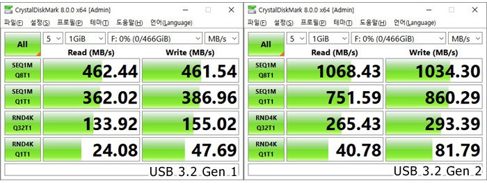 썬더볼트 4 단자를 지원해 빠른 데이터 전송이 가능하다. 상단의 사진은 외장SSD 를 이용해 속도 테스트를 진행하고 있는 모습으로 1,000MB/s 가 넘는 빠른 속도를 보여주었다.