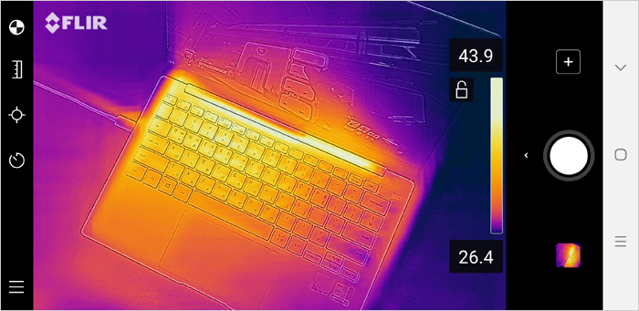 열화상 카메라를 이용해 게임 실행중 열분포를 확인하고 있는 모습으로 칩셋이 설치된 좌측을 중심으로 열이 퍼지는 것을 확인할 수 있다.