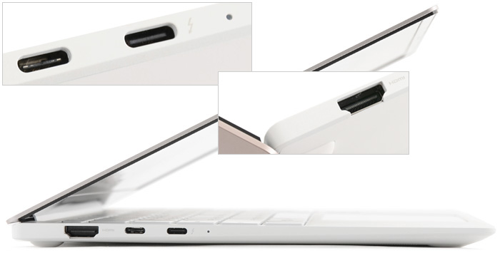 기기 좌측면의 모습으로 디스플레이 연결을 위한 HDMI 단자가 제공되며 11세대 인텔코어를 탑재한 최고급형 노트북 답게 썬더볼트 4 단자가 설치된 것을 확인할 수 있다. 또한 데이터 전송 및 주변기기 연결을 위한 C타입 단자가 제공되며 상태표시 LED가 장착된 것도 확인할 수 있다.