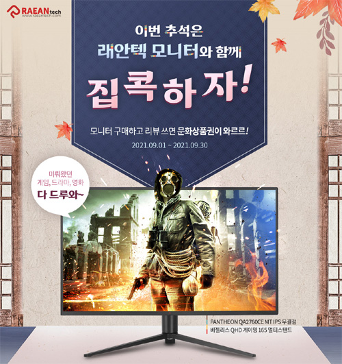 래안텍은 9월 추석을 맞아 자사 인기 모니터 18종을 대상으로 5,000원 문화상품권을 증정하는 ‘래안텍 모니터 구매 이벤트 이번 추석은 래안텍 모니터와 함께 집콕하자!’ 프로모션을 진행한다.