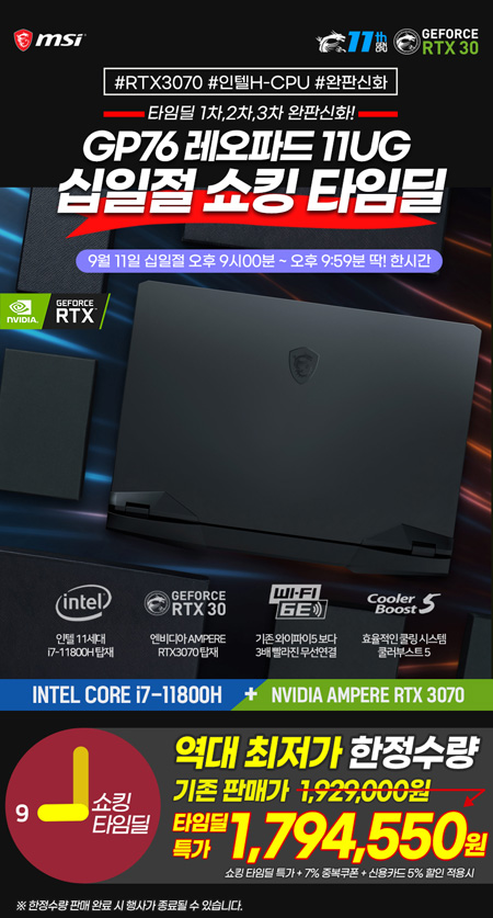 이번 타임딜 프로모션은 2021년 9월 11일 오후 9시부터 9시 59분까지 한시간 동안 진행된다. 입고 때마다 완판 행진을 기록하고 있는 'GP76 레오파드 11UG' 게이밍 노트북을 타임딜 특가와 7%(최대 7만 원) 중복 할인쿠폰 및 신용카드 할인이 적용되어 역대 최저가로 구매할 수 있다.