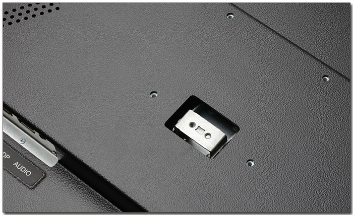 기기 후면부의 모습으로 양 측면에 5W + 5W 스피커가 부착되어 시원시원한 사운드를 즐길 수 있으며 OSD 버튼이 측면에 설치되어 손쉽게 모니터의 주요 기능을 조정할 수 있다.