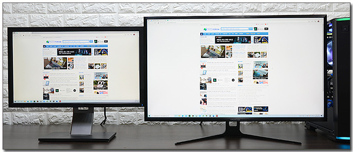 모니터를 PC와 함께 책상에 설치한 모습으로 32형 대화면 패널이 탑재되어 상당한 크기를 보여주었다. 집이나 사무실의 책상에 설치할 경우 넉넉한 공간 확보는 필수적이다.