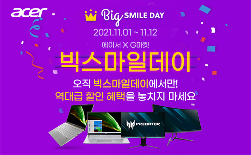 에이서는 지마켓과 옥션에서 오는 11월 12일까지 진행되는 ‘빅스마일데이’ 행사를 통해 주요 노트북을 역대 최저가에 판매한다고 밝혔다.
