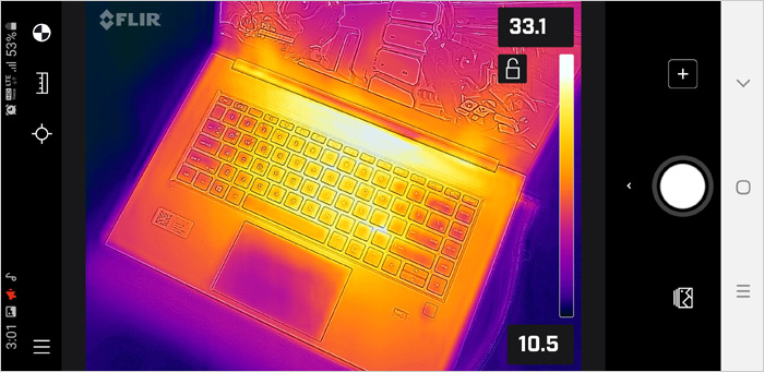 열화상 카메라를 이용해 게임 실행중 열분포를 확인하고 있는 모습으로 상단 중앙을 중심으로 열이 퍼져 나가며 특정 부분만 온도가 높은 대부분의 노트북과 같이 바닥면 전체에 열이 분포된 것을 확인할 수 있다. 표면 온도는 낮은편으로 열로 인한 스트레스 없이 노트북을 사용할 수 있을 것이다.