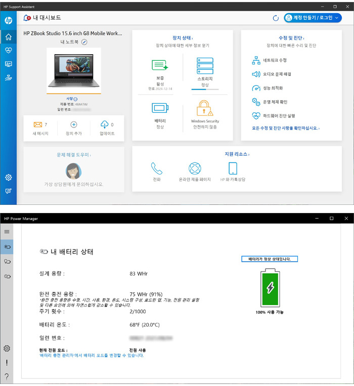 HP Support Assitant를 지원해 손쉽게 시스템 업데이트를 할 수 있고 시스템에 문제가 생겼을 때 빠르게 파악하고 대응할 수 있다. 또한 배터리 상태확인 및 관리를 위한 파워 매니져가 제공된다.