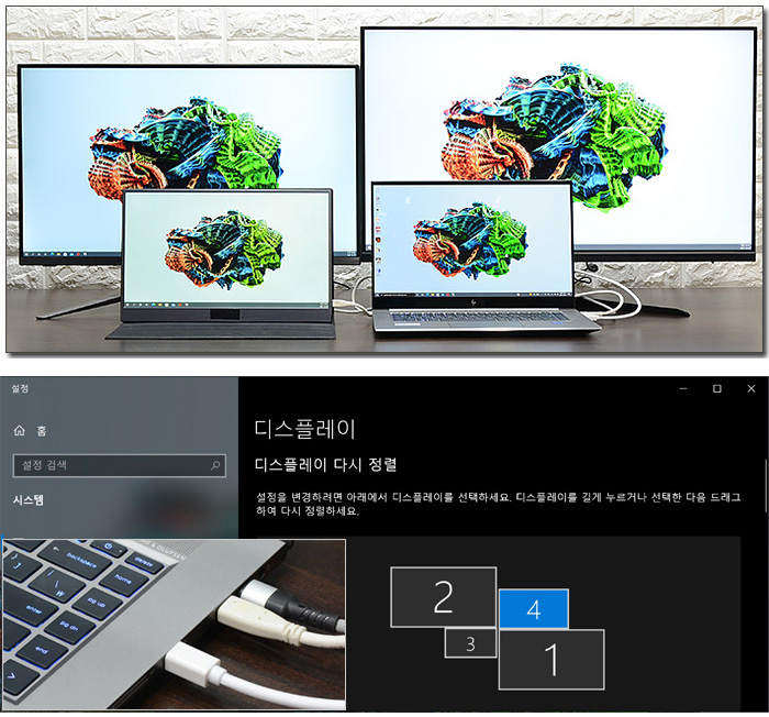HP ZBook Studio G8은 썬더볼트 4 단자와 mDP 단자에서 디스플레이 연결을 지원해 멀티 모니터 연결이 가능하다. 상단의 사진은 4K 모니터와 QHD, FHD 모니터를 연결한 모습으로 정상 작동하는 것을 확인할 수 있다. (4K@60Hz 지원)