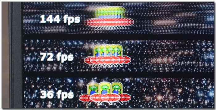 144Hz 주사율을 쉽게 인지할 수 있도록 하위 프레임과 같이 재생되는 영상 (960 Pixel Per Sec) 을 셔터스피드 1/20 로 촬영한 모습이다. 프레임이 낮을수록 캐릭터의 수가 적으며 프레임이 높아질수록 시간당 많은 화면이 뿌려지기 때문에 캐릭터의 수가 많은 것을 확인할 수 있다.