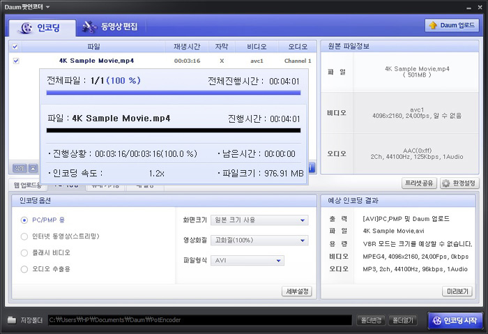다음 팟인코더를 이용해 4K 동영상의 인코딩 테스트를 진행하고 있는 모습으로 4분 01초의 짧은 인코딩 시간을 보여주었다.