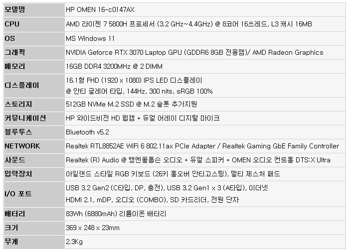 이번에 리뷰를 진행 할 HP OMEN 16-c0147AX는 최신 3D 게임을 최상위 옵션에서 즐기고 싶은 유저등을 위한 게이밍 노트북으로 8코어 16스레드를 지원하는 라이젠 7 5800H 프로세서와 지포스 RTX 3070, 16GB DDR4 메모리 조합으로 보급형이나 고급형 제품과는 확연히 다른 성능을 경험할 수 있다.