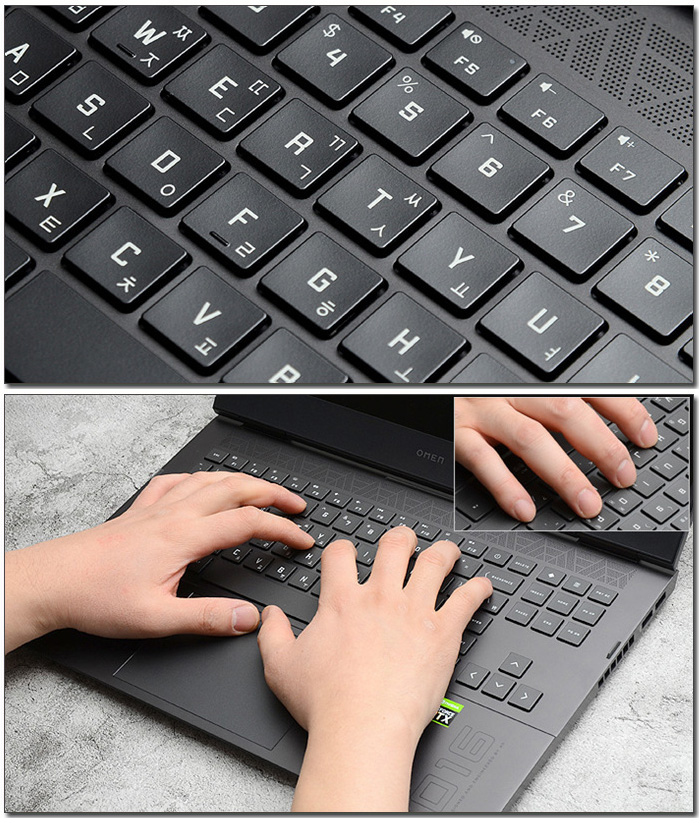 키보드의 모습으로 풀사이즈 방향키가 설치된 텐키리스 치클릿 키보드가 적용된 것을 확인할 수 있다. 엑셀 등의 숫자입력이 많은 작업에서는 다소 불편이 따를 수 있지만 게임을 즐길때 에는 훨씬 편하게 사용할 수 있다. (OMEN 제품중 인텔 프로세서 탑재 제품은 텐키를 지원하며 AMD 탑재 모델은 텐키를 지원하지 않는다. 이점 참조 바란다.)