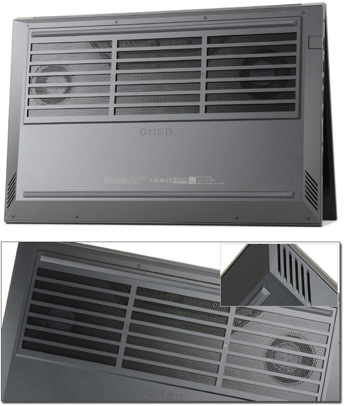 기기 후면부의 모습으로 통풍구가 설치된 것이 눈에 띈다. 이 제품은 3방향 환기와 5방향 에어플로우로 안정성을 높인 OMEN 템페스트 쿨링 기술이 적용되어 열로 인한 스로틀링 없이 장시간 높은 성능으로 게임을 즐길 수 있으며 소음을 크게 줄였다.