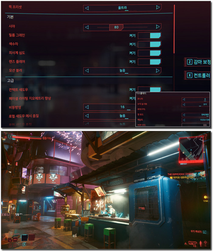 사이버펑크 2077을 플레이 하고 있는 모습으로 울트라 옵션에서 50-61 프레임으로 플레이 되는 것을 확인할 수 있었다. 울트라 옵션 적용이 불가한 보급형 게이밍 노트북과 분명한 성능차를 경험할 수 있었다.