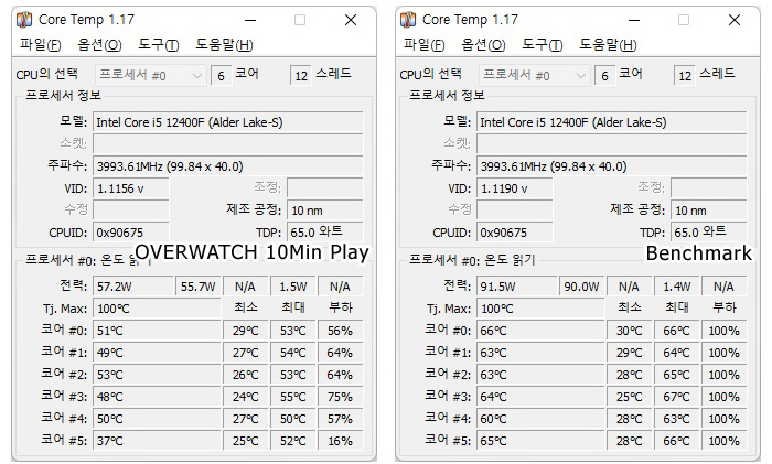 오버워치를 이용해 온도를 확인하고 있는 모습으로 (실내 온도 13도) IDLE에서는 20도 정도로 동작했으며 오버워치를 실행했을 때에는 53도 까지 온도가 올라가는 것을 확인할 수 있었다. (보통 30-40도 정도로 플레이 되었다.) 또한 CPU 부하가 100% 로 걸리는 벤치마크 실행시 65도 까지 온도가 올라갔다. (PC케이스에 넣고 기본 쿨러를 사용하는 일반 환경에서는 온도가 좀더 높을 것이다.)