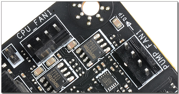 논K프로세서의 기본 쿨러 뿐만 아니라 수냉쿨러 등도 편하게 사용할 수 있도록 워터펌프의 속도를 제어할 수 있도록 펌프 핀 헤더를 제공하며 CPU 팬을 위한 별도의 팬 헤더도 설치된 것을 확인할 수 있다. 또한 스피커 비프음으로 PC의 이상현상을 감지해야 하는 구형 PC와 달리 DEBUG LED가 부착되어 부팅시 발생되는 이상증상을 바로 파악할 수 있다.
