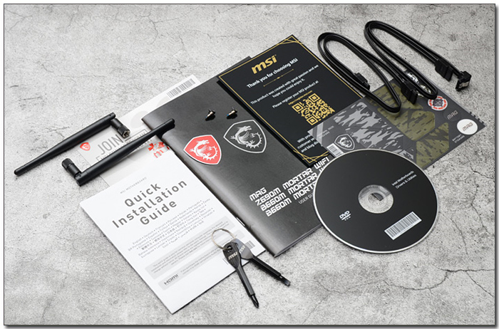 풀KIT의 모습으로 중급형 메인보드 답게 다양한 구성품이 제공되는 것을 확인할 수 있다. 사용설명서와 퀵 매뉴얼을 비롯해 WiFi 안테나와 스티커, SATA 케이블을 지원하며 드라이버와 EZ M.2 클립, S/W CD 등이 포함되어 있다.