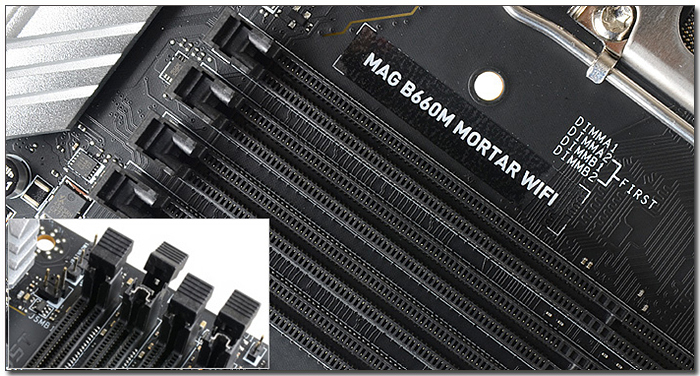 메모리 슬롯의 모습으로 B660칩셋이 장착된 중급형 메인보드 임에도 4개의 슬롯이 제공되는 것을 확인할 수 있다. 총 128GB 용량을 지원해 게이밍 PC는 물론 대용량 메모리 사용이 필수적인 전문작업용 PC용으로도 활용할 수 있으며 최대 6200MHz를 지원하고 XMP 3.0 기술도 적용되어 DDR5 4800MHz 기본램 뿐만 아니라 고클럭을 지원하는 튜닝램을 장착해 성능을 높일 수 있다. @ B660 메인보드중 2개의 메모리 슬롯을 제공하는 제품도 판매되고 있기 때문에 대용량 메모리를 사용해야 할 경우 반드시 슬롯 숫자를 확인해야 한다.
