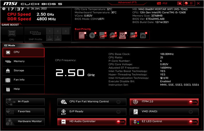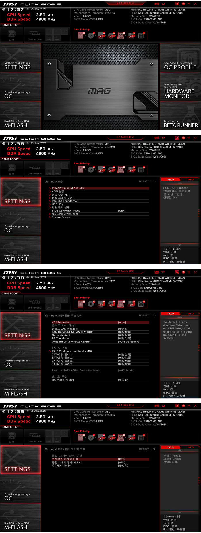12세대 인텔코어 논K 프로세서는 구형 바이오스를 사용할 때 성능이 저하되는 이슈가 발생하고 있다. 테스트를 진행하는 B660M 박격포에서 발생하는 현상은 아니었지만 혹시모를 성능저하가 염려되어 최신 바이오스로 업데이트를 진행했다. (메인보드의 바이오스가 2021년 11월 이전일 경우 반드시 최신 바이오스로 업데이트 하기 바란다.) @ 리뷰를 진행하는 B660M 박격포 메인보드는 바이오스에 M-FLASH 메뉴가 제공되어 손쉽게 업데이트 할 수 있었다.