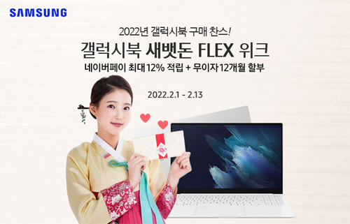 유니씨앤씨는 2022 설날을 기념하여, AMOLED 디스플레이와 초슬림 초경량 디자인으로 뛰어난 휴대성을 자랑하는 삼성 갤럭시북 프로 / 프로360 / 프로360 5G을 대상으로 네이버페이 최대 12% 적립과 12개월 무이자 할부 등의 푸짐한 혜택이 증정되는 ‘삼성 갤럭시북 새뱃돈 FLEX 위크’ 프로모션을 2022년 2월 1일부터 2월 13일까지 네이버 스마트스토어를 통하여 단독 진행한다.