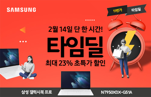 유니씨앤씨는 다가오는 신학기를 맞아 15.6인치 대화면 AMOLED 디스플레이와 지포스 외장그래픽이 탑재된 삼성 갤럭시북 프로 NT950XDX-G51A 모델을 대상으로 최대 34만원 중복 할인과 함께 푸짐한 혜택이 주어지는 ‘타임딜’ 프로모션을 2022년 2월 14일 15시부터 단 1시간 동안 11번가를 통하여 단독 진행한다.