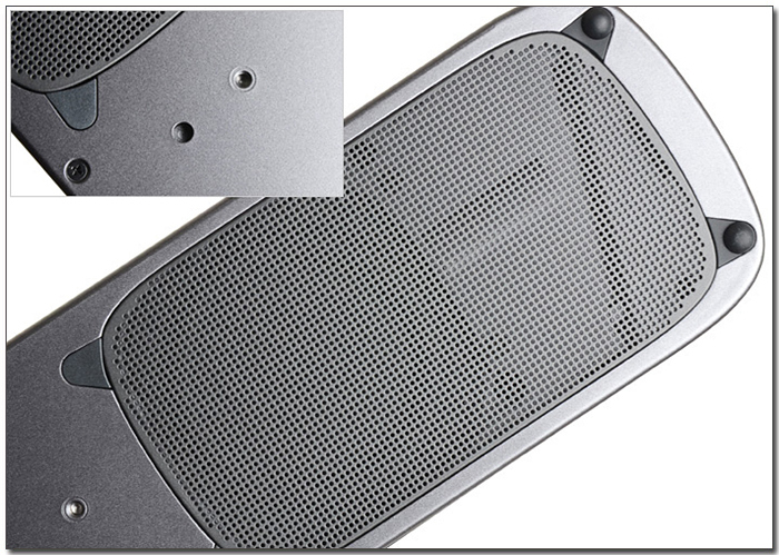 기기 바닥면의 모습으로 저움 재생에 사용되는 패시브 라디에이터가 설치된 것을 확인할 수 있으며 양 측면에는 미끄러짐 및 부밍 방지를 위해 고무패드가 장착되어 있다. 또한 중앙에는 월마운트 브라켓 장착을 위한 홀이 설치되어 벽걸이 TV와 같이 벽에 걸어놓고 사용할 수 있다.