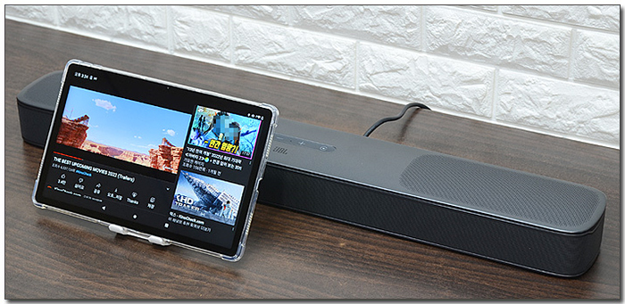 스마트폰과 태블릿PC를 블루투스로 연결해 사운드를 즐기고 있는 모습으로 디바이스에 장착된 스피커와는 비교 자체가 안될 정도로 박진감 넘치는 사운드를 즐길 수 있었다. 거실에 JBL BAR 5.0 멀티빔 사운드바를 설치해 놓고 스마트폰이나 태블릿으로 음악이나 영화를 볼때마다 유용하게 사용할 수 있다. (한번 연결해 놓은 후 소스를 BT로 변경하면 자동으로 스피커와 디바이스가 연결된다.)