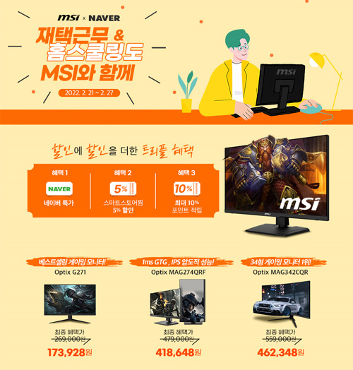 MSI는 국내 최대 검색포털 ‘네이버’에서 재택근무 및 홈스쿨링 기획전을 통해 게이밍 모니터 특가 판매를 진행한다.