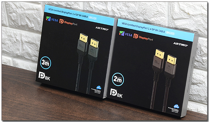 아트뮤 VESA 인증 DP to DP 1.4 8K 케이블 메탈 1M와 2M, 3M 3종류로 출시되며 모든 케이블의 두께는 동일하다. 특히 VESA 인증을 받은 고급형 케이블 답게 길이에 따른 대역폭 성능저하는 발생하지 않는다. (일부 저가형 모델의 경우 3M 이상의 케이블에서 성능저하가 발생한다.)