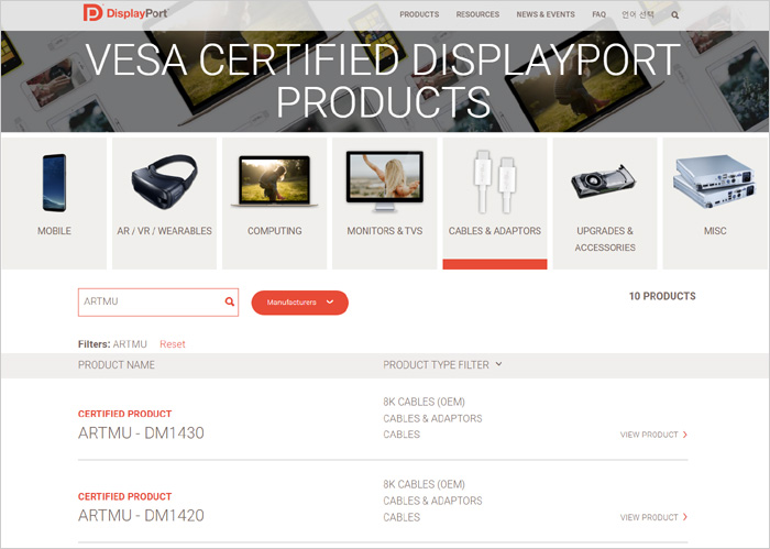 VESA 공식 인증 제품의 경우 VESA 및 DP 공식 홈페이지에서 손쉽게 확인할 수 있다. 상단의 사진은 VESA 와 DP 홈페이지에서 아트뮤를 검색한 모습으로 관련 제품들이 등록된 것을 확인할 수 있다.