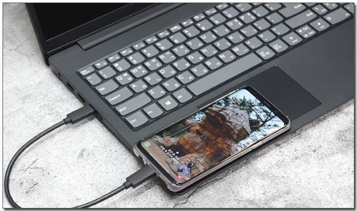 C타입 단자는 상시전원을 지원해 노트북이 꺼진 상태에서도 스마트폰을 연결해 충전할 수 있다. 상단의 사진은 스마트폰을 연결한 모습으로 정상적으로 충전되는 것을 확인할 수 있었다.