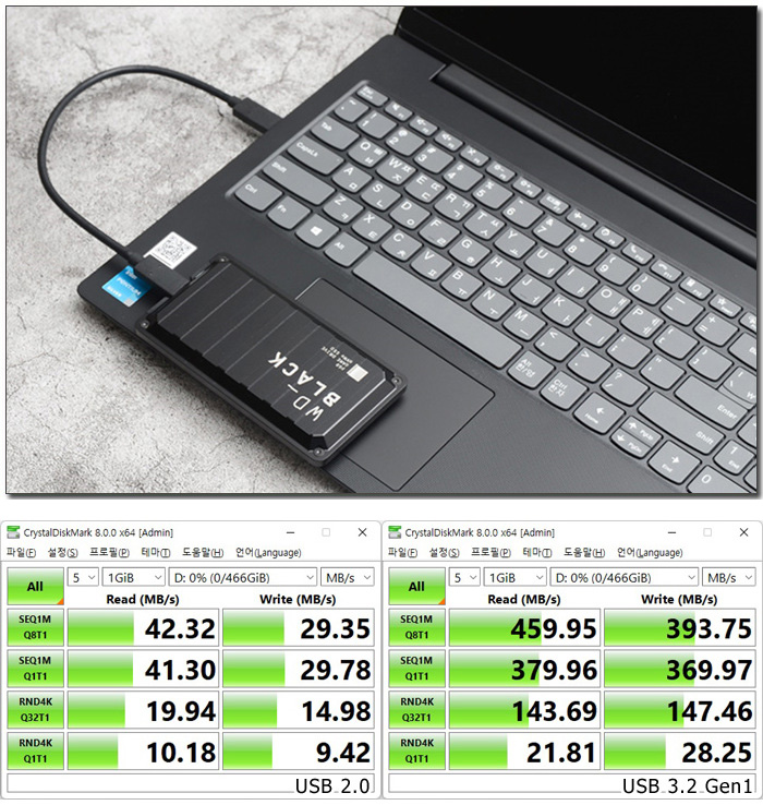 A타입과 C타입의 USB 3.2 Gen1 단자를 지원해 빠른 데이터 전송이 가능하다. 상단의 사진은 외장 SSD를 이용해 속도를 측정하고 있는 모습으로 USB 2.0과 확연한 차이가 발생하는 것을 확인할 수 있다.