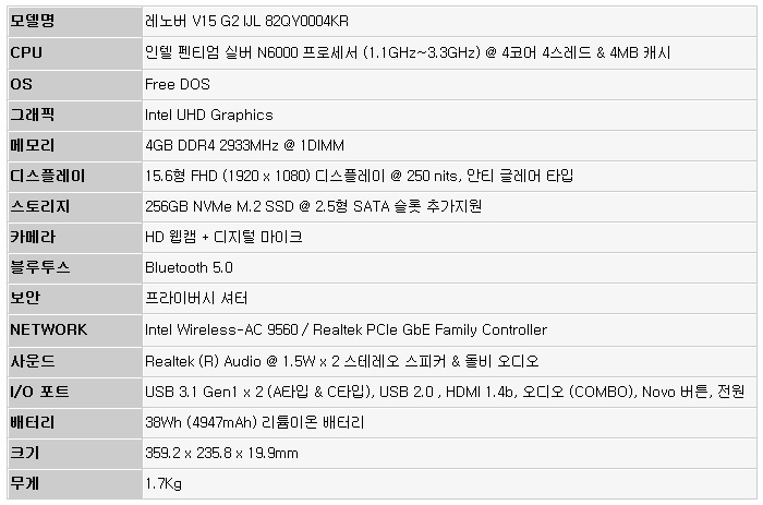 레노버 V IJL 시리즈는 15형 디스플레이에 펜티엄 실버 N6000 이 탑재된 82QY0004KR을 비롯해 N4500이 탑재된 82QY0002KR과 14형 디스플레이를 탑재한 82QX0002KR (N6000), 82QX0000KR (N4500) 이 출시 되었거나 출시할 예정이다. 또한 유통사에서 부품 업그레이드를 지원하고 있다. 메모리와 NVMe SSD, 추가 스토리지 장착 등의 서비스를 진행하고 있으니 옵션을 통해 원하는 스펙으로 제품을 구입하기 바란다.