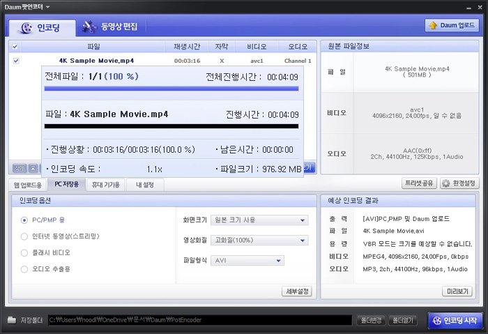 다음 팟인코더를 이용해 4K 동영상의 인코딩을 진행하고 있는 모습으로 4분 09초가 소요되는 것을 확인할 수 있었다.
