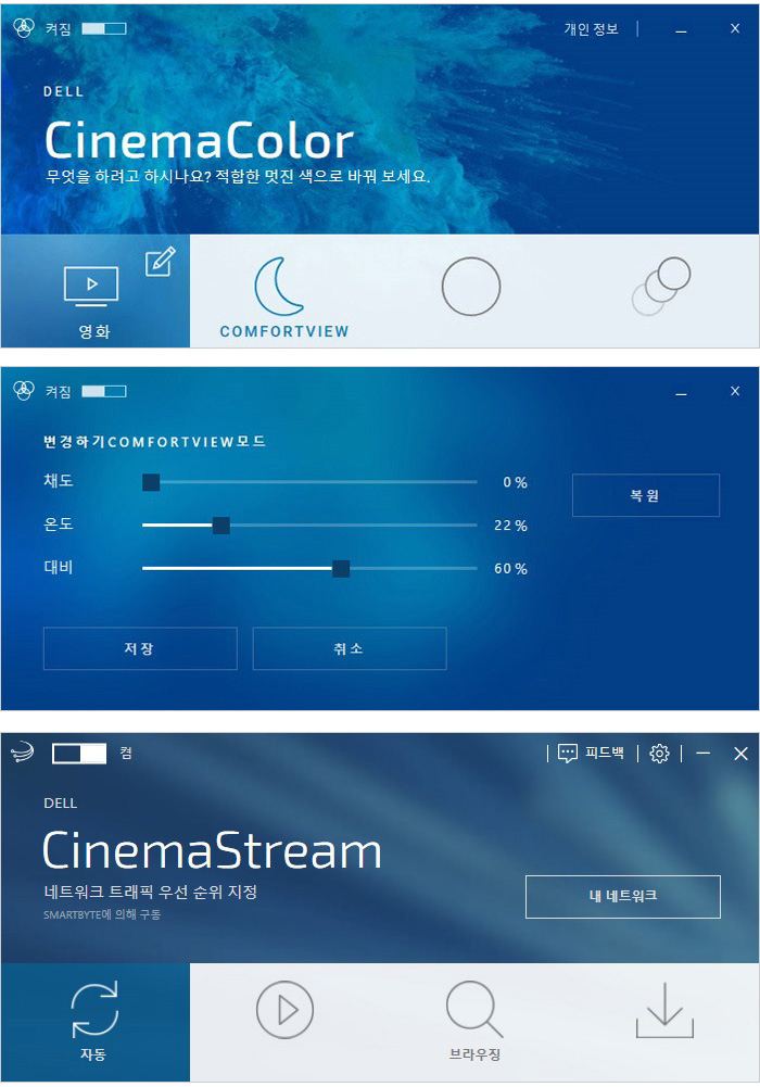 최적의 컬러를 설정할 수 있는 델 시네마 컬러 앱이 제공되어 사용 컨텐츠에 따라 색감을 조정할 수 있다. 특히 눈의 피로감을 줄여주는 컴포트 뷰 모드가 제공되며 모든 모드는 상세 설정을 통해 채도와 색온도, 대비 등을 조절할 수 있다. 또한 네트워크 트래픽의 우선순위를 사용자 임의대로 지정할 수 있는 시네마 스트림 앱도 제공되어 쾌적한 무선 네트워크를 즐길 수 있다.