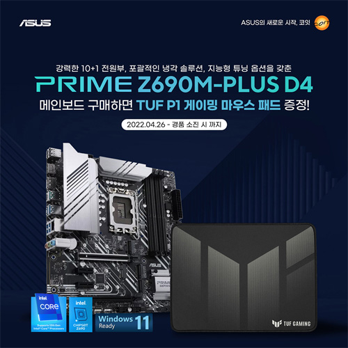 4월 26일부터 경품 소진 시까지 진행하는 이번 이벤트는 컴퓨존, 조이젠, 아이코다, 가이드컴, 컴퓨터코리아, 아이티엔조이 등 주요 PC 쇼핑몰에서 코잇 ASUS PRIME Z690M-PLUS D4를 구매하면 ASUS TUF P1 게이밍 마우스 패드를 증정한다. 이벤트에 대한 자세한 내용은 각 PC 쇼핑몰을 통해 확인할 수 있다.