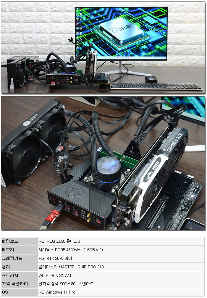 테스트 시스템의 모습으로 오버클럭을 통해 최상의 성능을 구현할 수 있도록 고급형 Z690 메인보드인 MSI MEG Z690 UNIFY를 사용했으며 하이닉스 DDR5 메모리를 듀얼채널로 구성했다. 또한 발열을 효과적으로 제어하기 위해 수냉쿨러를 사용했으며 900W 의 파워 서플라이와 12세대 인텔코어에 최적화된 윈도우 11을 설치해 테스트를 진행했다.