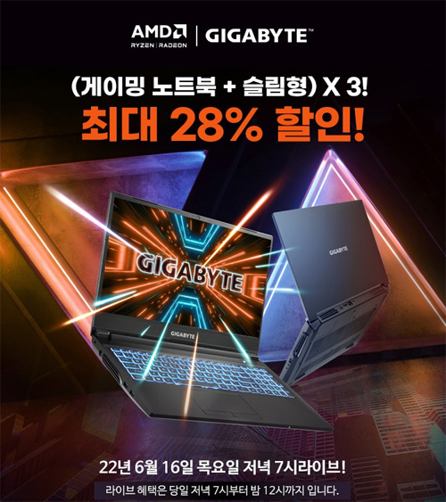 행사 모델인 기가바이트 AMD 게이밍 노트북인 A시리즈 제품은 17형인 A7, 15형인 A5로 두 가지 크기다. A시리즈는 가성비 게이밍 노트북으로 가심비까지 만족시킬 수 있는 성능과 가격으로 구성되어 있다. AMD 라이젠 R7-5800H(or R5-5600H)와 지포스 RTX 3060 GDDR6 6GB를 탑재하여, 고사양 게임 및 그래픽 작업도 원활하게 구동이 가능하며 최대 240Hz 고주사율, 광시야각 IPS 디스플레이와 초슬림베젤을 적용하여 역동적인 게임에서 보다 더 부드럽고 생생한 몰입감으로 게임을 즐길 수 있다. 또한 100% sRGB 색재현율, 300nit 밝기로 언제 어디서나 선명하고 매끄러운 디스플레이 경험을 제공한다.