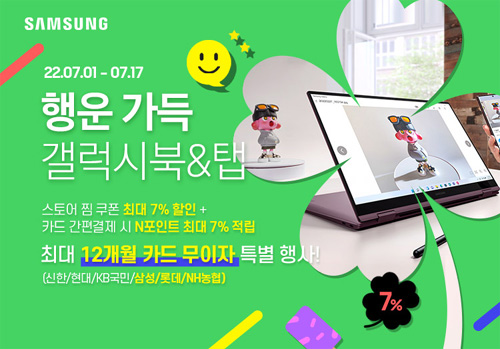 엔씨디지텍에서 7월1일부터 7월17일까지 삼성노트북 갤럭시북 시리즈 모델들을 대상으로 행사 특별 할인과 다양한 혜택이 가득한 ‘행운가득 갤럭시북’ 특별 기획행사를 진행한다고 한다.