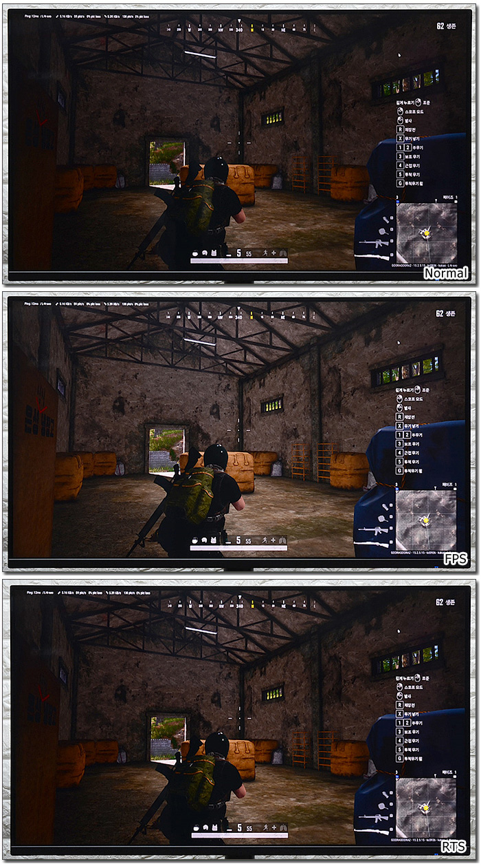 100 단계 블랙레벨 설정을 지원해 게임에서 유용하게 사용할 수 있다. 사진과 블랙레벨이 높아질수록 시인성이 높아져 숨어있는 적을 빠르게 발견하고 대응할 수 있다. (단, 블랙레벨이 너무 높으면 선명도가 떨어지기 때문에 상황에 맞게 적용해야 한다.)