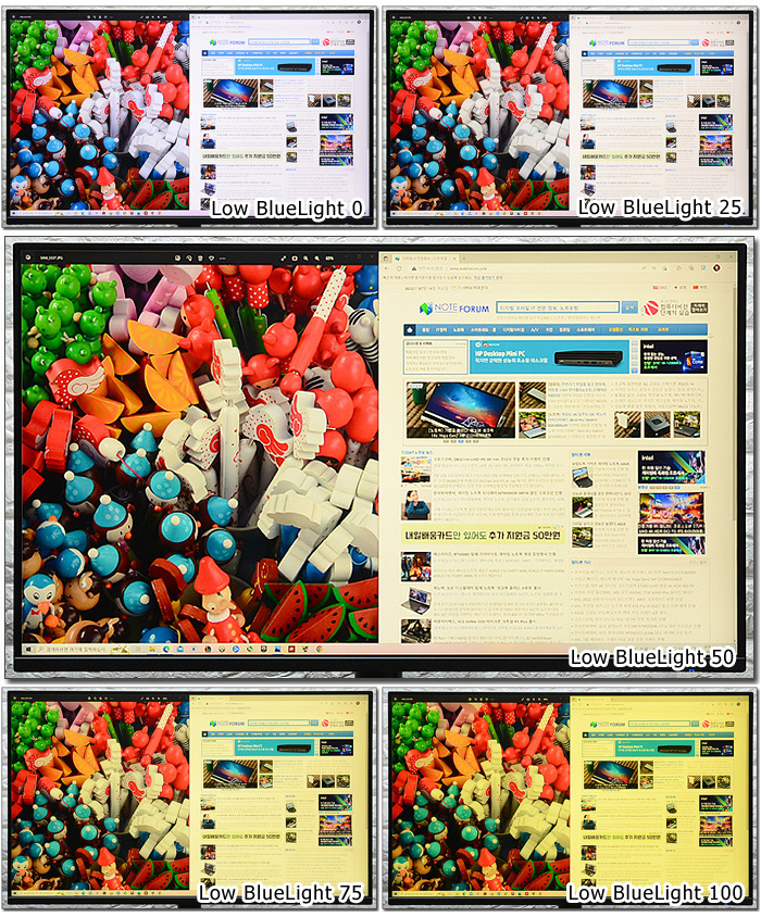 눈건강을 위한 기술도 지원하고 있다. 상단의 사진은 눈건강을 해치는 블루라이트 감소 기능을 테스트 하고 있는 모습으로 설정값에 따라 확연한 차이가 발생하는 것을 확인할 수 있다. (게임이나 멀티미디어 감상 보다는 흰색 배경에서 작업이 이루어지는 웹서핑이나 오피스 등에서 사용하기에 적합하다. 디자인 작업 등에서는 컬러가 왜곡되기 때문이다.)