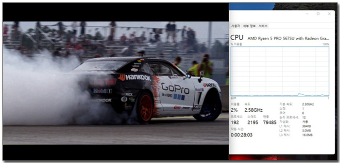 4K 동영상을 이용해 CPU 이용율을 테스트 하고 있는 모습으로 1-3%대의 안정적인 모습을 보여 주었다. 웹서핑과의 멀티테스킹시 30%대 후반까지 점유율이 올라가기는 했지만 영상과 웹사이트 모두 끊어짐은 발생하지 않았다.