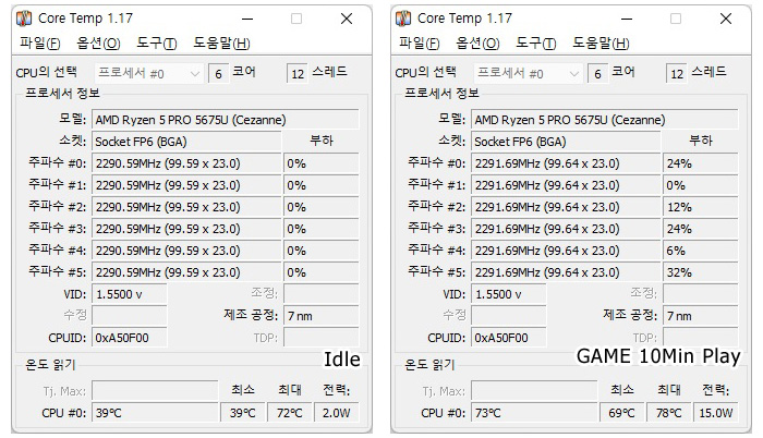 CPU 온도를 측정한 모습으로 (실내온도 27도) IDLE 상태에서는 39도 정도로 작동했으며 10분 동안 오버워치를 실행한 후 온도를 측정했을 때에는 70~75도 사이로 실행되는 것을 확인할 수 있었다. @ 테스트를 진행하는 내내 80도 이상으로는 온도가 올라가지 않았다.